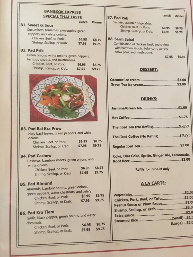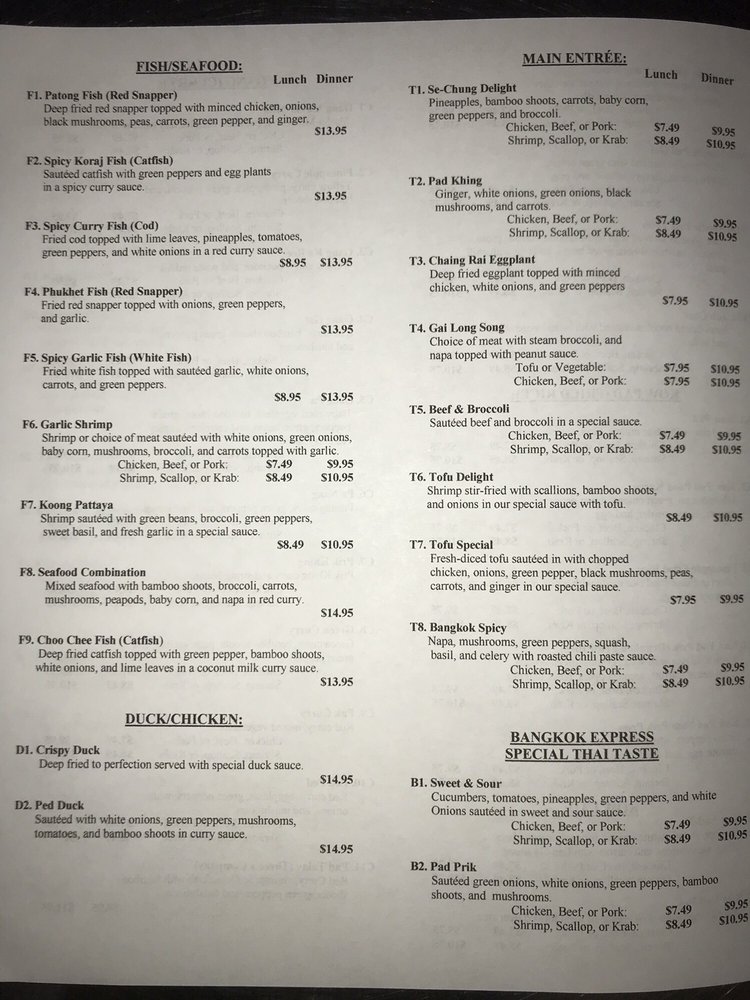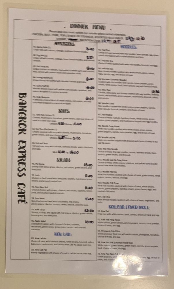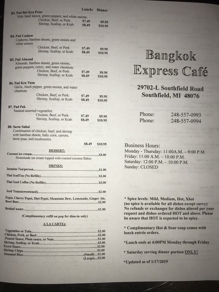 Bangkok Express is a Thai restaurant located in Southfield, MI, known for its authentic and flavorful dishes. The menu features a variety of options, including salads like the refreshing Apple Salad and the zesty Pla Koong. Appetizers like the Crab Rangoon and Koong Hom Pa offer a delicious start to your meal. Noodle lovers can indulge in dishes like Noodle Pad Gai and Pad SeeLaw. Customers rave about the quality of food and excellent customer service, with favorites like the Pad Thai and hot and sour soup standing out. Despite its unassuming appearance, Bangkok Express impresses with its generous portion sizes and consistently delicious offerings, making it a favorite spot for Thai cuisine in the Southfield area.